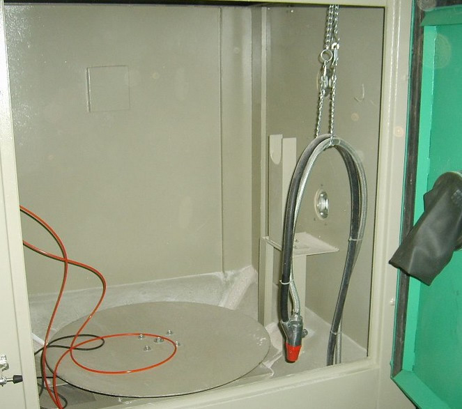 7、配備活動台車和轉盤,操作(zuò)時(shí)将工件放(fàng)在轉盤上(shàng),然後推入機内即可噴砂作(zuò)業,操作(zuò)簡單省力;